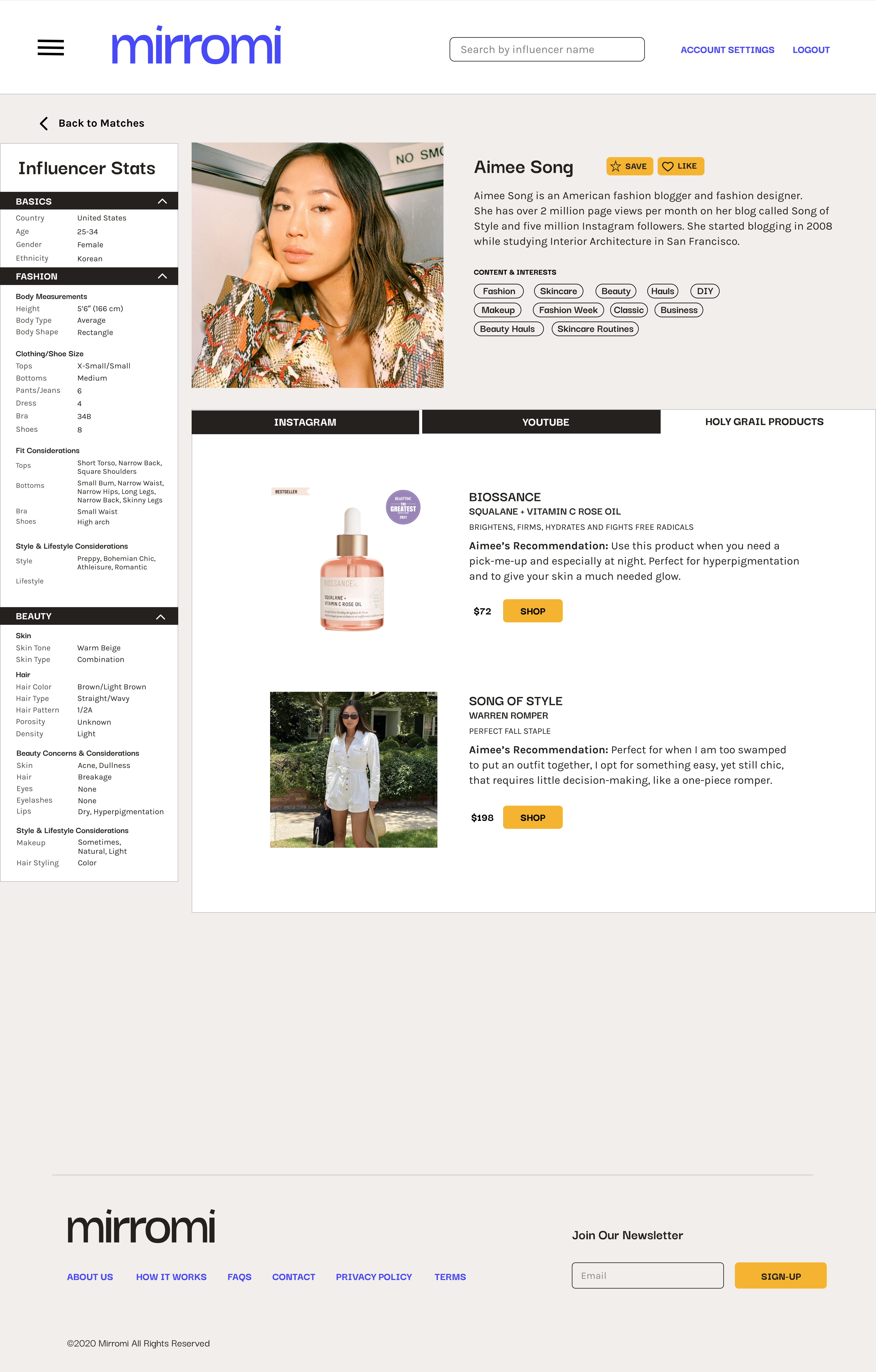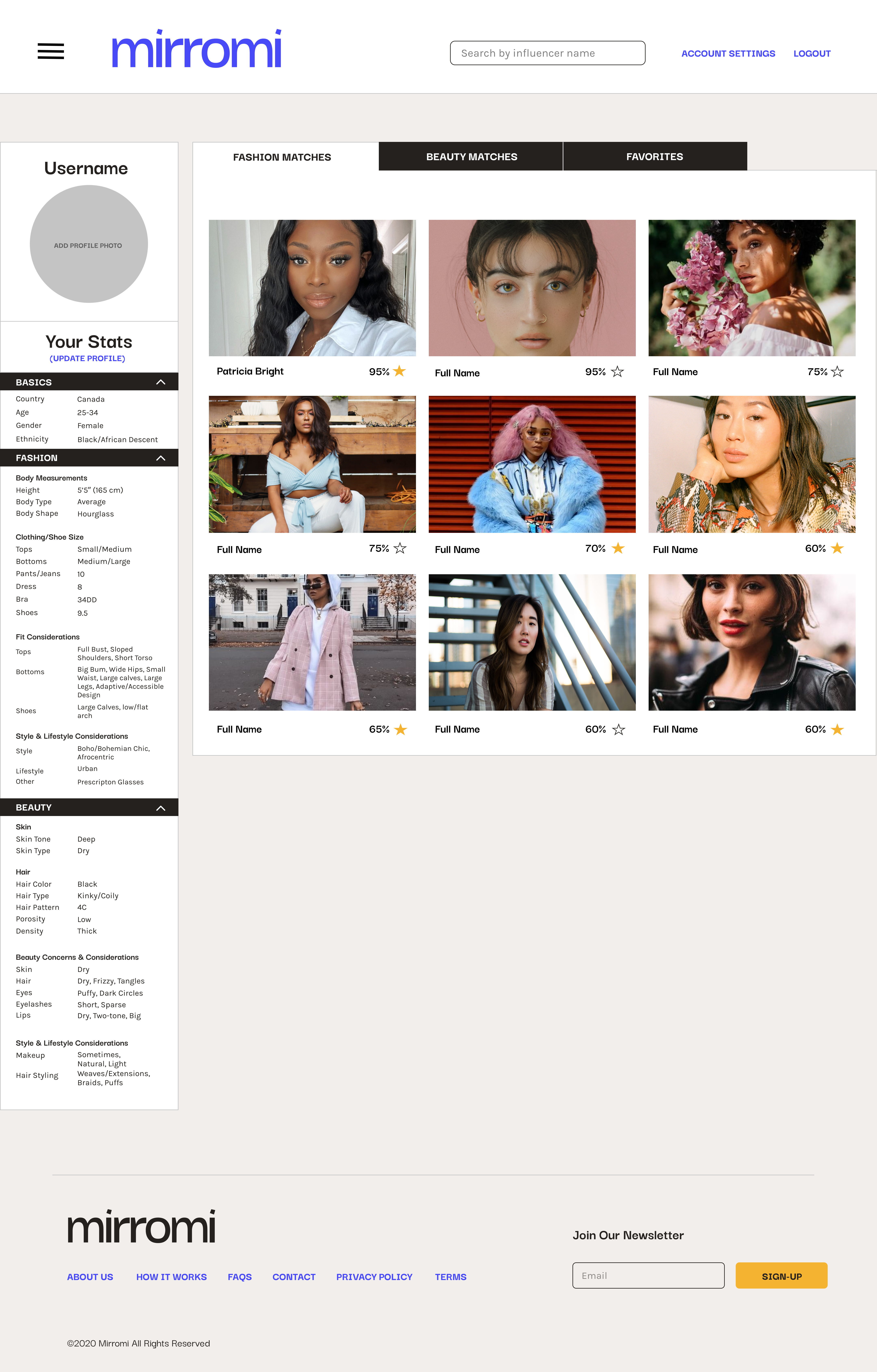 Mirromi is a web application that matches underrepresented consumers with fashion and beauty influencers based on similar skin, hair and body attributes to help make it easier to find products (makeup for all skin tones, skincare for all skin types, accommodations for disabilities, etc.) and inspiration for styles that will work for them.